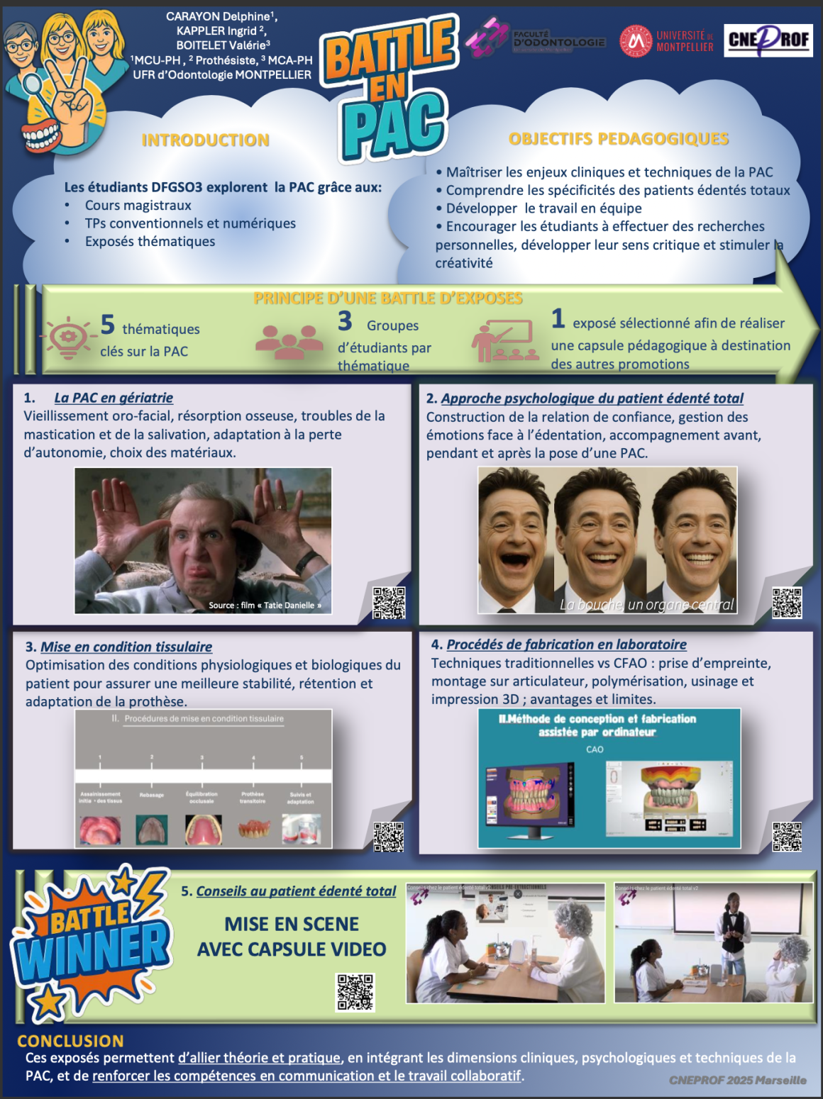 Au sein de l’UFR de Montpellier, l’apprentissage de la prothèse amovible complète (PAC) en DFGSO3 comprend outre les classiques cours magistraux et TPs conventionnels et numériques, la réalisation d’exposés thématiques.