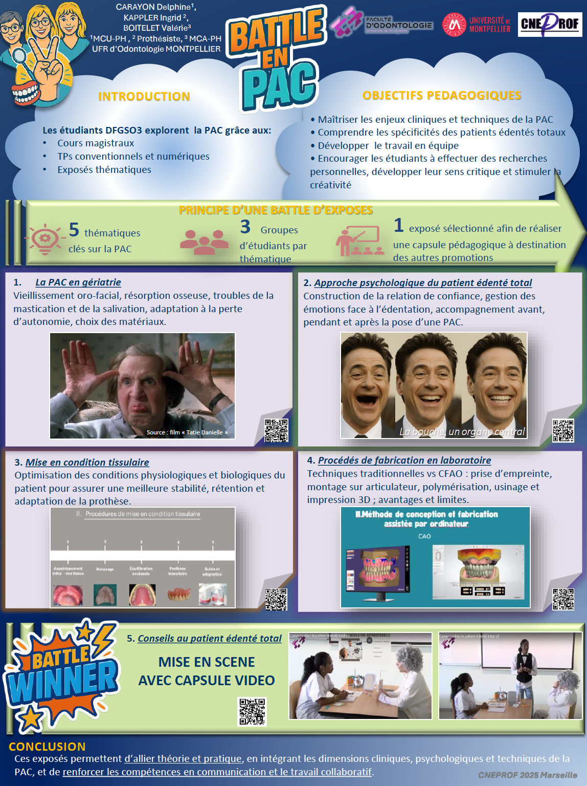 Au sein de l’UFR de Montpellier, l’apprentissage de la prothèse amovible complète (PAC) en DFGSO3 comprend outre les classiques cours magistraux et TPs conventionnels et numériques, la réalisation d’exposés thématiques.