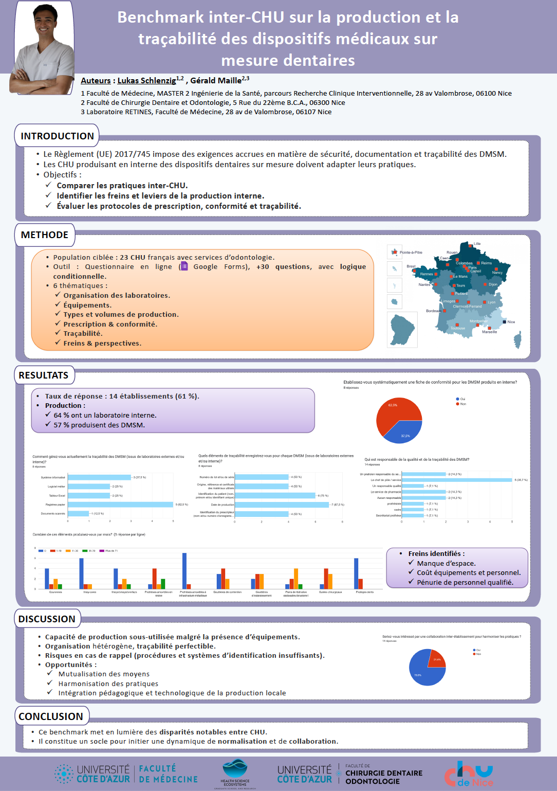 Face aux exigences accrues du Règlement (UE) 2017/745 en matière de sécurité, de traçabilité et de documentation des dispositifs médicaux sur mesure (DMSM), les établissements de santé producteurs doivent adapter leurs pratiques. Dans les CHU, la production interne de DMSM dentaires non stériles soulève des enjeux réglementaires et organisationnels spécifiques. Afin d’évaluer la diversité des pratiques et d’identifier les freins et leviers à la conformité, un benchmark national a été initié sous la forme d’une enquête inter-CHU.