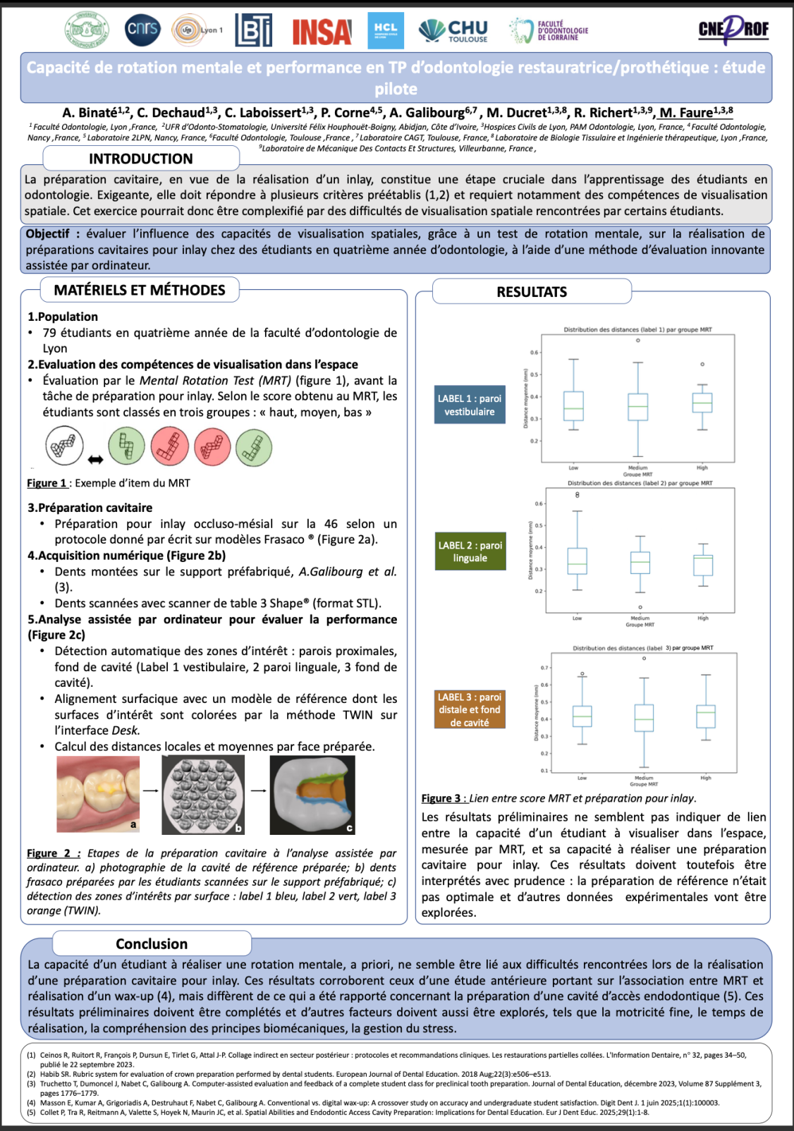 Ce poster présente une étude pédagogique menée auprès d’étudiants de 4e année de l’UFR d’odontologie de Lyon. La préparation cavitaire en vue d’un inlay est une étape essentielle dans l’apprentissage des étudiants. Elle peut être rendue complexe par des difficultés de visualisation spatiale. Ces capacités peuvent être évaluées par le Mental Rotation Test (MRT).