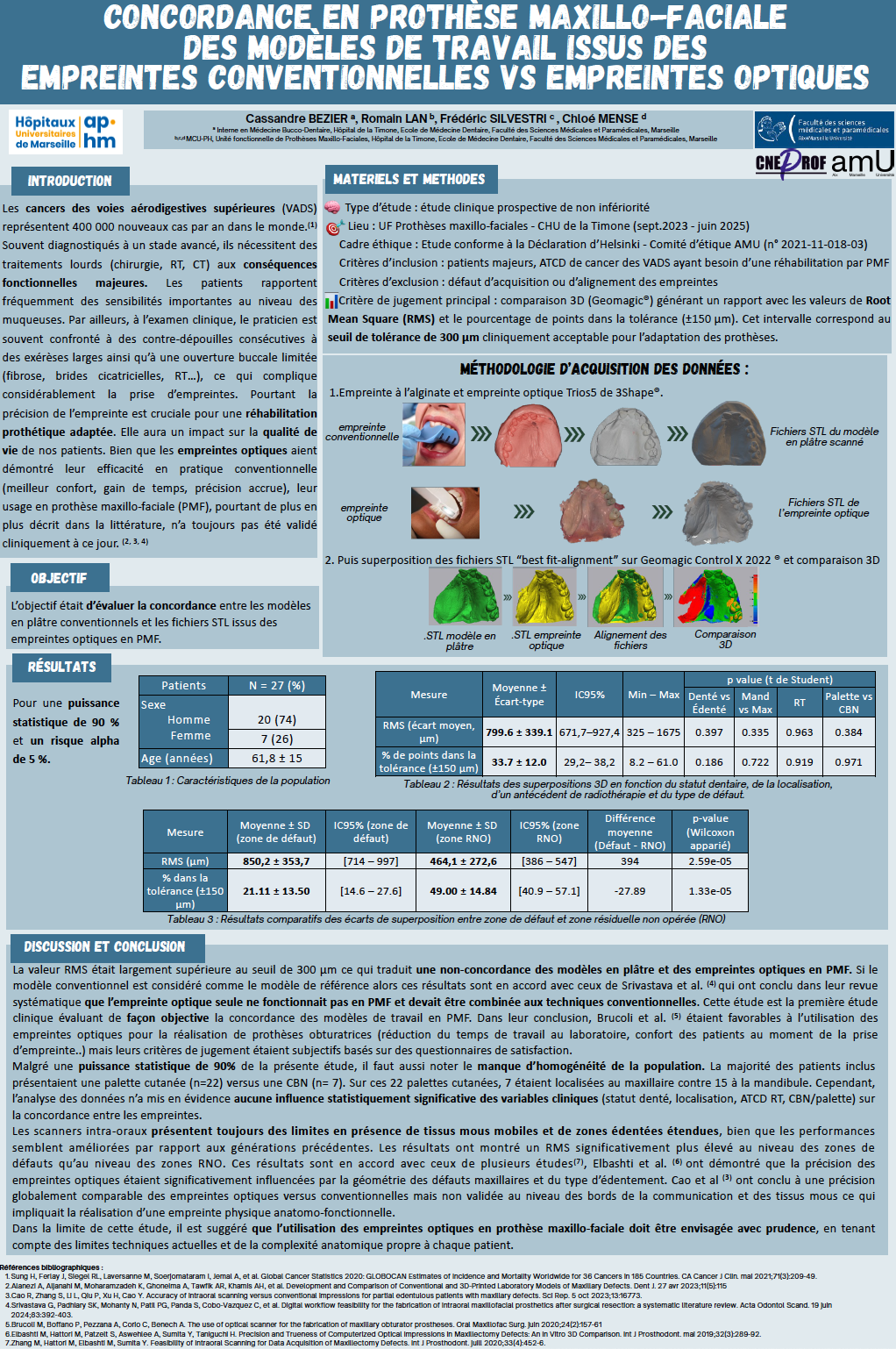 Matériel et méthode : Les empreintes de 27 patients ont été analysées. Les modèles conventionnels ont été numérisés puis comparés aux empreintes optiques par superposition optimale (« best-fit alignment ») à l’aide du logiciel Geomagic Control X 2022®. Après traitement et alignement des fichiers, une comparaison 3D a été réalisée, générant automatiquement un rapport comprenant les valeurs de Root Mean Square (RMS) et le pourcentage de points dans la tolérance (±150 µm). Cet intervalle de ±150 µm correspond au seuil de tolérance de 300 µm cliniquement acceptable pour l’adaptation des prothèses.