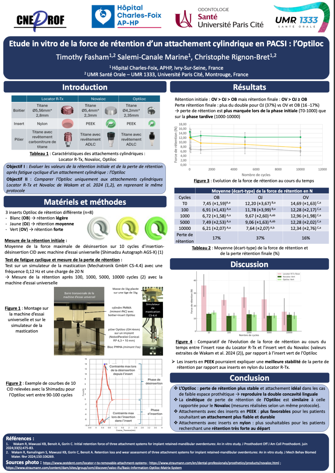 Conclusion : La cinétique de perte de rétention de l’Optiloc est comparable à celle rapportée pour le Novaloc. L’insert en PEEK pourrait expliquer cette stabilité, suggérant un intérêt pour la satisfaction du patient.