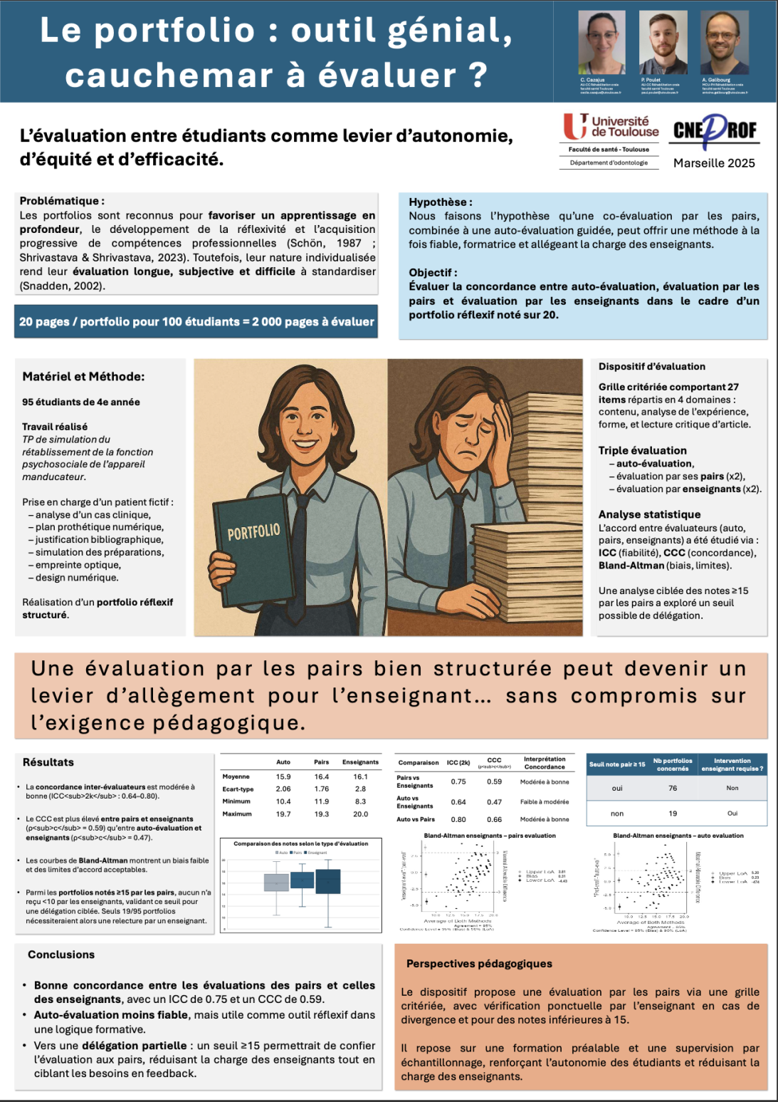 Nous avons exploré une solution d’évaluation partagée : chaque étudiant a réalisé une auto-évaluation et évalué deux de ses pairs à l’aide d’une grille critériée, avant que chaque portfolio ne soit noté par deux enseignants. Les scores, ramenés sur 20, ont été comparés à l’aide de l’ICC, du CCC et de courbes de Bland-Altman.