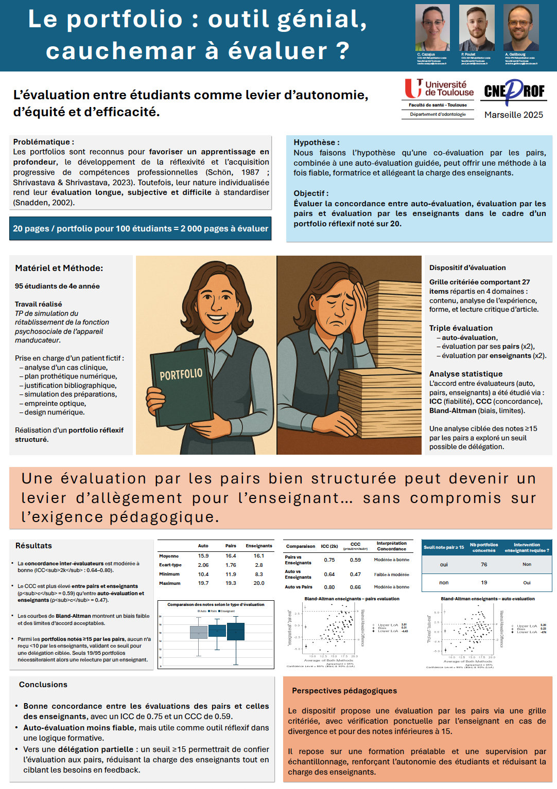 Nous avons exploré une solution d’évaluation partagée : chaque étudiant a réalisé une auto-évaluation et évalué deux de ses pairs à l’aide d’une grille critériée, avant que chaque portfolio ne soit noté par deux enseignants. Les scores, ramenés sur 20, ont été comparés à l’aide de l’ICC, du CCC et de courbes de Bland-Altman.