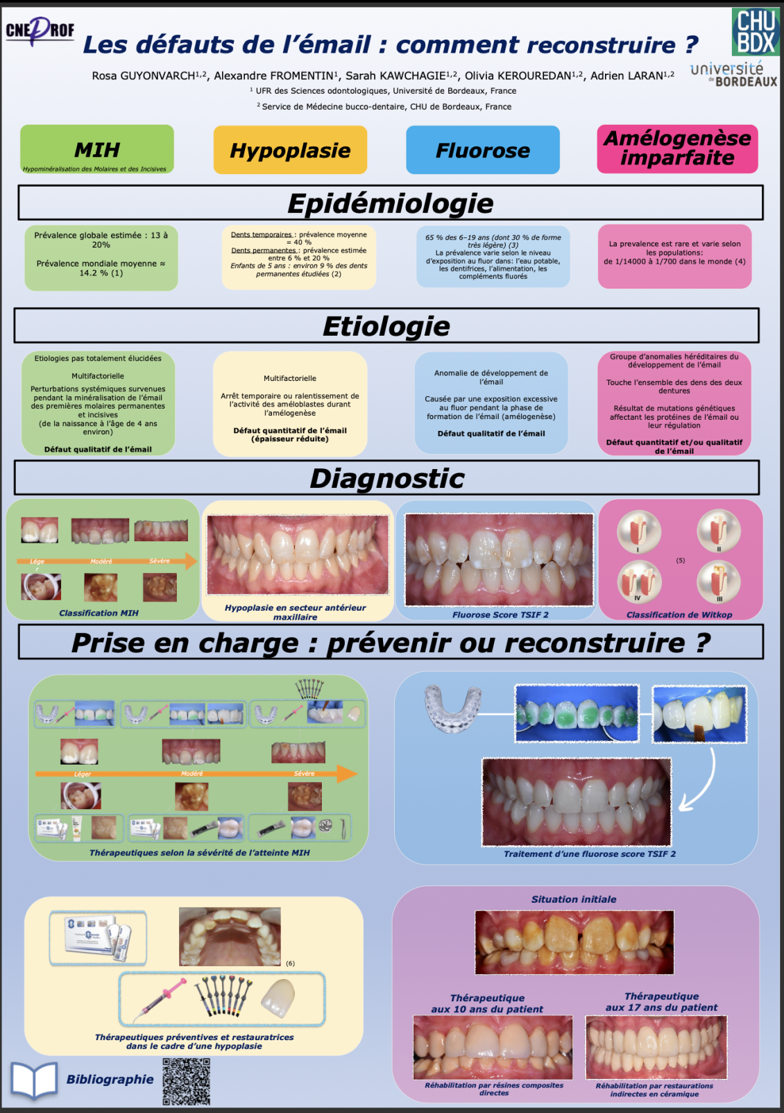 Les défauts amélaires regroupent quatre lésions principales : la MIH, la fluorose, l’hypoplasie et l’amélogenèse imparfaite. Ce posterprésente leurs caractéristiques pour faciliter le diagnostic et la prise en charge, ainsi que quelques thérapeutiques réalisées au CHU de Bordeaux.