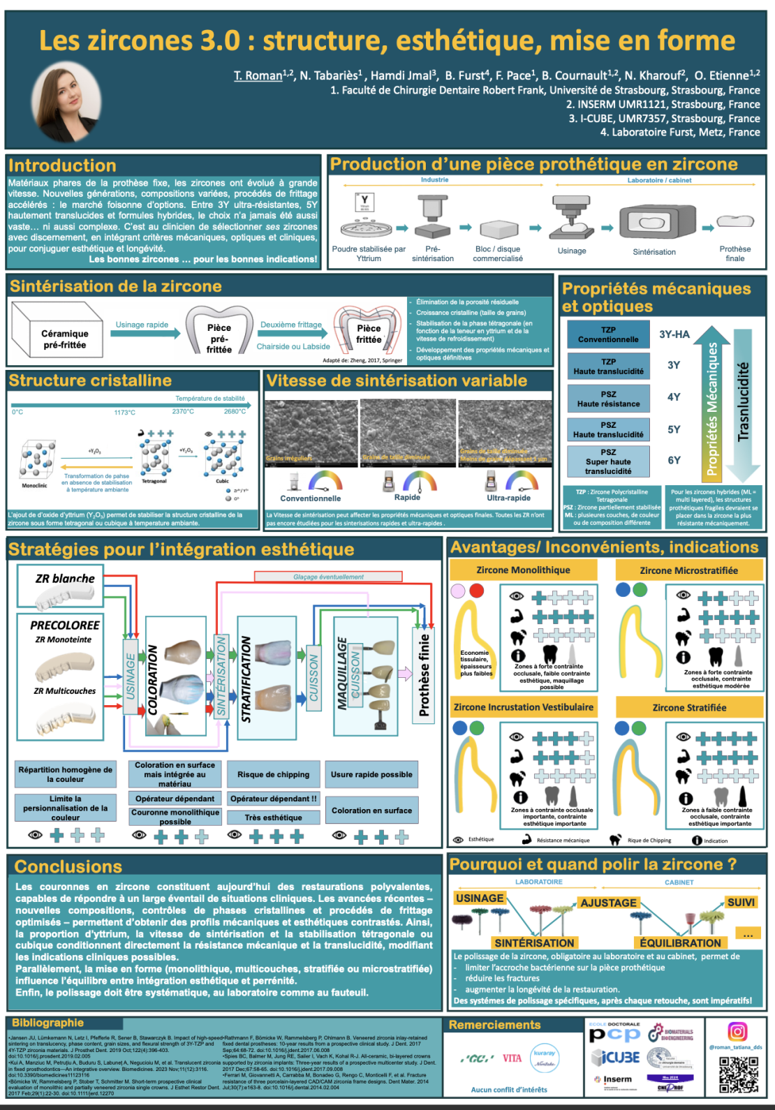 Les zircones constituent aujourd’hui un pilier de la prothèse fixe, alliant résistance mécanique et potentiel esthétique. Leur évolution rapide a conduit à une multiplication des formulations, allant des 3Y-TZP ultra-résistantes aux 5Y-PSZ hautement translucides, en passant par des compositions intermédiaires hybrides. Ces variations reposent principalement sur la teneur en oxyde d’yttrium, influençant la structure cristalline (tétragonale ou cubique) et, par conséquent, les propriétés optiques et mécaniques. Parallèlement, les techniques de sintérisation se sont diversifiées, avec l’apparition de cycles rapides et ultra-rapides. Si ces procédés permettent un gain de temps notable, leur impact sur la durabilité des restaurations reste dépendant du type de zircone et nécessite une évaluation préalable.