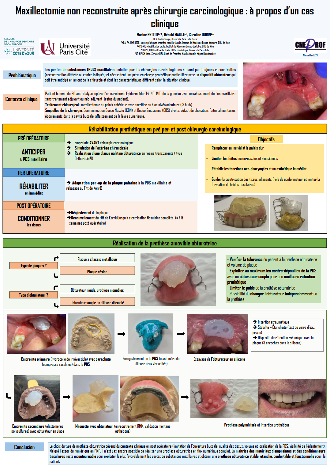 Les pertes de substances (PDS) maxillaires induites par les chirurgies carcinologiques ne sont pas toujours reconstruites (reconstruction différée ou contre indiquée) et nécessitent une prise en charge prothétique particulière avec un dispositif obturateur qui doit être anticipé en amont de la chirurgie.