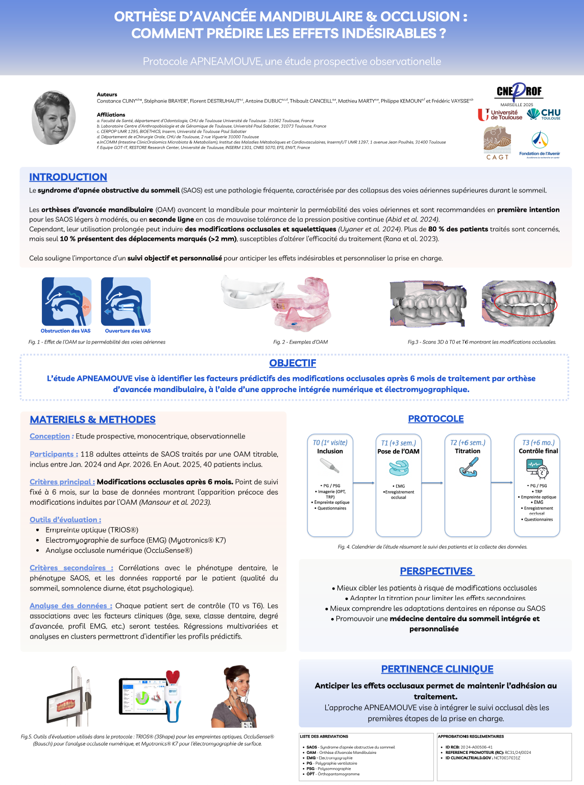 L’étude APNEAMOUVE est une étude prospective, observationnelle et monocentrique menée au CHU de Toulouse. Elle vise à évaluer les modifications occlusales en 3D et l’activité musculaire masticatoire après six mois de traitement par OAM, à l’aide d’une approche numérique multimodale. Un total de 118 patients adultes atteints de SAHOS, traités par OAM titrable sur mesure, seront inclus. Le critère principal est l’analyse des modifications occlusales via trois outils complémentaires : (1) analyse morphogéométrique des empreintes numériques (TRIOS®, 3Shape), (2) électromyographie de surface (Myotronics® K7), (3) analyse occlusale numérique (OCCLUSENS®, Bausch). Les critères secondaires incluent les liens entre ces modifications et les caractéristiques dentaires initiales, le phénotype du SAHOS, le degré d’avancée mandibulaire, les profils EMG et les questionnaires patients (PSQI, ESS, ISI, SF-36, GAD-7, PHQ-4).